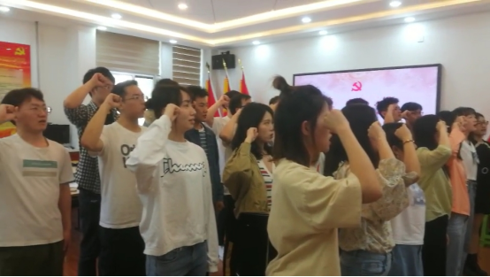 伴着庄严的《国际歌》,入党宣誓仪式正式开始,铿锵的歌声不仅响彻教室,更把歌曲的深刻意义渗入每一位党员的心里。激昂的歌声过后,支部书记带领全体预备党员进行宣誓。25名预备党员面向党旗,举起右手,在领誓人的逐句领读下,用慷慨激昂的语气,庄严向党旗宣誓,每个同学都用心表达对党的忠诚、为共产主义事业奋斗终身的决心。面对着党旗,大家接受了一次身心的特殊洗礼。