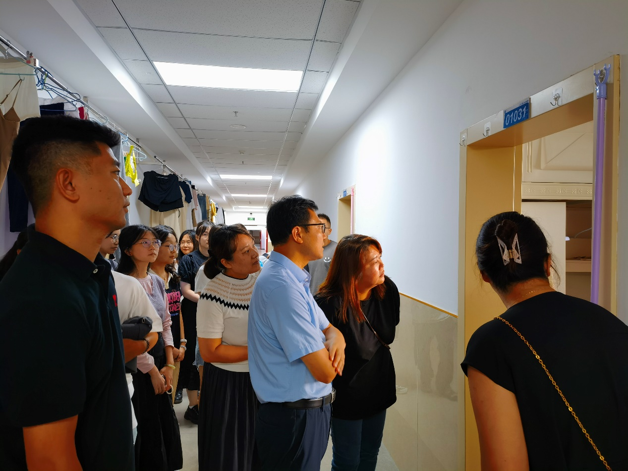 为了深入了解新生生活需求,了解员工思想动态,使新生尽快适应老员工活,8月27日下午,太阳成tyc122cc软件经理杨博老师、太阳成tyc122cc副经理王恩老师、太阳成tyc122cc副经理申海老师以及研究生辅导员张译心老师携着温暖的关怀,共同来到太阳成tyc122cc北苑三公寓和北苑四公寓,开展了寝室走访活动,为新生们送去了一份暖心的问候。