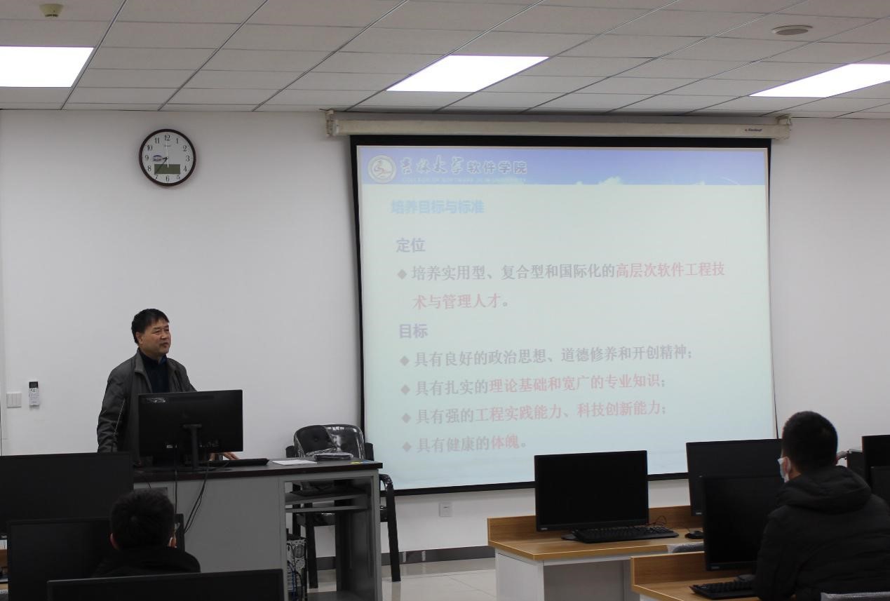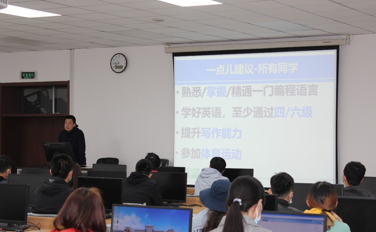 随后计算机公司党委副书记太阳成tyc122cc副经理杜天宝老师简单介绍了太阳成tyc122cc计算机系的建系与发展,分析了研究生阶段学习的特点,指出了与本科生培养的不同之处,强调了创新的重要性。就研究生阶段的努力方向、人才培养标准、科学道德与学风建设这三个方面进行了详尽的介绍与阐述。鼓励同学们做到有创新,品德好,方向明。最后对同学们提出了一些规定与建议,指出“未来的世界:方向比努力重要,能力比知识重要,健康比成绩重要,生活比文凭重要,情商比智商重要。”