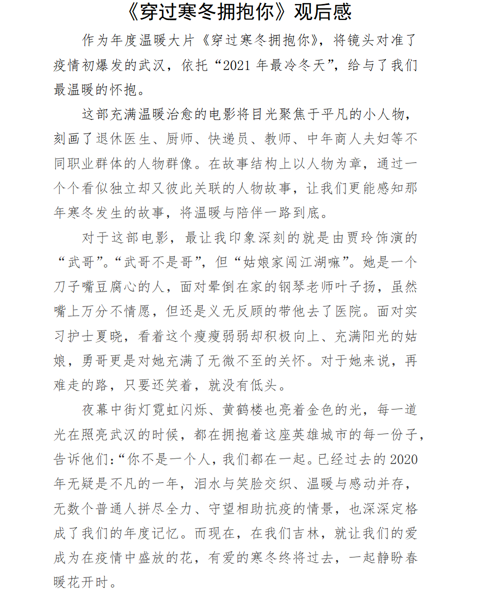 活动持续了两个小时,在观影结束后,许多同学感慨万分,纷纷写下了观后的感悟。同学们写道“泪水与笑脸交织、温暖与感动并存,无数个普通人拼尽全力、守望相助的抗疫情景,深深定格在我们的年度记忆中。”“匆匆疫情三年,让人们懂得了珍惜,懂得了如何去爱,懂得了众志成城。”“伤痛终会愈合,寒冬终将过去,每一个活下来的人终会穿过寒冬彼此温情相拥。”