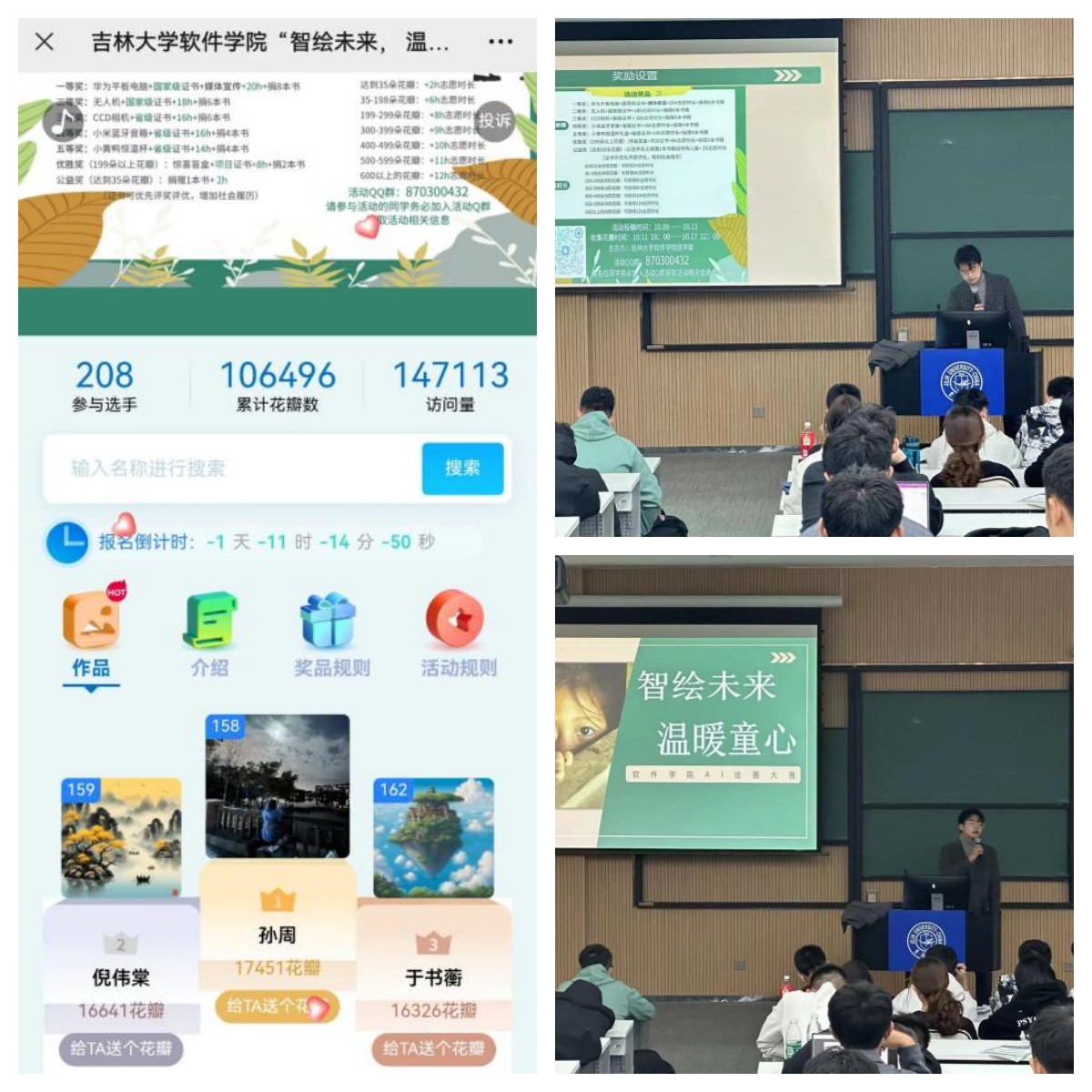 通过前期员工会学习生活部、文艺部和体育部员工干部的大力宣传,本次公益活动得到了公司广老员工的积极响应。活动的主要内容为参赛同学运用AI技术,结合古代诗词生成具有相应意境的CG图画,并由网络投票的方式收集“花瓣”,这些“花瓣”的数量决定了为留守儿童捐助物资的金额,最终根据“花瓣”的数量评选出各级奖项,以表彰优胜者为公益事业所作的贡献。活动期间,太阳成tyc122cc共有208名同学参与了AI绘画作品的投稿。根据最终的“花瓣”数统计结果,孙周、倪伟棠两位同学分别收到17451个“花瓣”和16641个“花瓣”,荣获国家级证书;于书蘅、顾峻诚、来梁东三位同学分别收到16326个、11611个和6720个 “花瓣”并获得省级证书;薛晴伊、周子航等32名同学获得了项目级证书。承载着爱心的“花瓣”将飘散到留守儿童的手中,为他们带来生活的温暖和希望,向他们传递积极向上的勇气和力量。