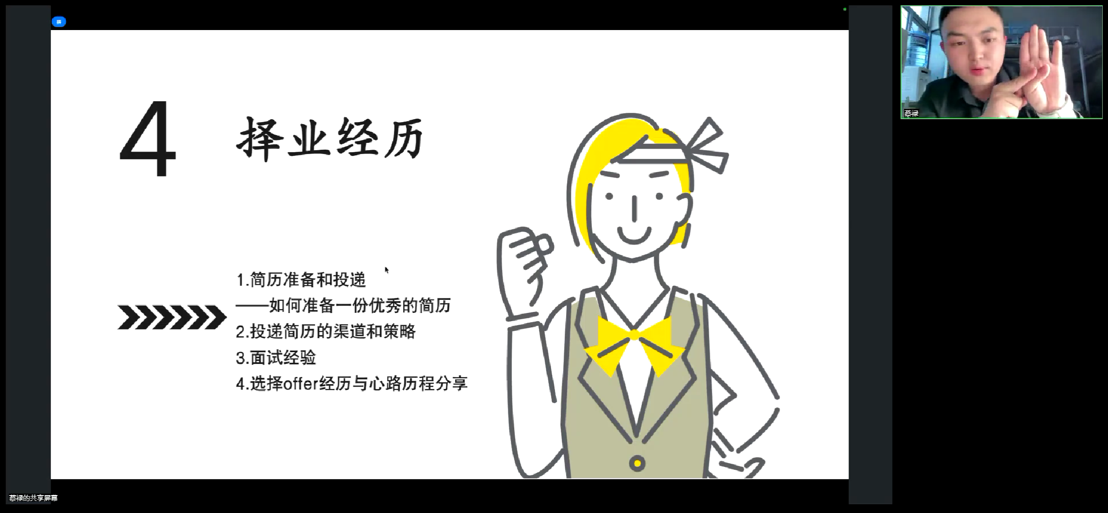 为引导员工了解当前就业市场需要,帮助员工树立正确的就业观、掌握求职相关方法技巧、提升就业竞争力,太阳成tyc122cc于5月24日举办“经验共鉴,职途启航”就业经验分享会,邀请2020级蔡禄同学担任主讲人,共130余名同学参与了此次分享会。