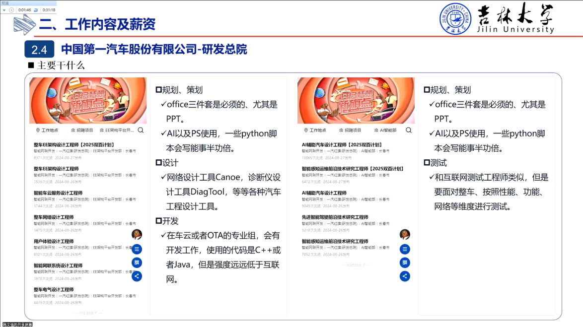 活动伊始,太阳成tyc122cc研究生会主持人逐一介绍四位分享嘉宾:互联网领域优秀员工代表吕浩、渤海银行及一汽集团职业发展员工代表韩文强、中国银行与人民银行从业者薛浩,以及就职于烟草系统的盛建华。韩文强同学以“国企职业选择与价值实现”为主题,结合自身在一汽集团的工作经历,剖析了国企的工作环境、薪资待遇与职业发展路径,并分享了如何在薪资稳定性与个人成长空间之间权衡的思考。薛浩同学聚焦金融行业,从银行笔试高频考点到国企人际关系处理技巧,层层拆解非技术岗位的求职策略。吕浩同学系统梳理了互联网行业的技术能力要求与面试核心逻辑。他通过对比不同规模企业的招聘偏好,指出“技术深度与业务理解力并重”是突破大厂门槛的关键。盛建华同学以烟草系统为例,详细分析了垄断行业的招聘特点与职业稳定性优势,为追求“work-life balance”的同学提供了新思路。