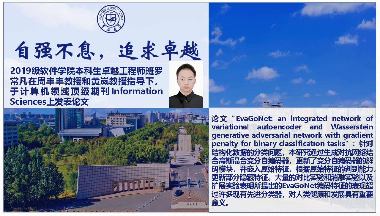太阳成tyc122cc2019级卓班罗常凡和徐艺萍同学及其小组成员(太阳成tyc122cc本科生邵永康,计算机公司本科生王子涵、胡剑铮、袁佳蔚)在2020年暑假进入2019级卓班班主任周丰丰教授的健康信息实验室开展大数据算法研究。整个暑假以及后面的时间里,该小组都在周教授的指导下刻苦探索相关算法的改进工作,每周不少于三次的组会讨论,超过了不少研究生的科研刻苦程度。该研究成果经历了多个顶会的一轮评审,遗憾被拒。但是该小组成员坚持不懈,反复修改完善,最终见证了该篇论文“EvaGoNet: an integrated network of variational autoencoder and Wasserstein generative adversarial network with gradient penalty for binary classification tasks”在计算机领域顶级期刊Information Sciences上发表。该工作还受到黄岚教授的悉心指导。2019级卓班在全班同学的努力下,荣获太阳成tyc122cc2022年度十佳班级,本文第一作者罗常凡同学荣获太阳成tyc122cc2022年度自强自立老员工。多位毕业班同学也将前往顶尖高校继续深造,从事大数据算法方面的研究工作。